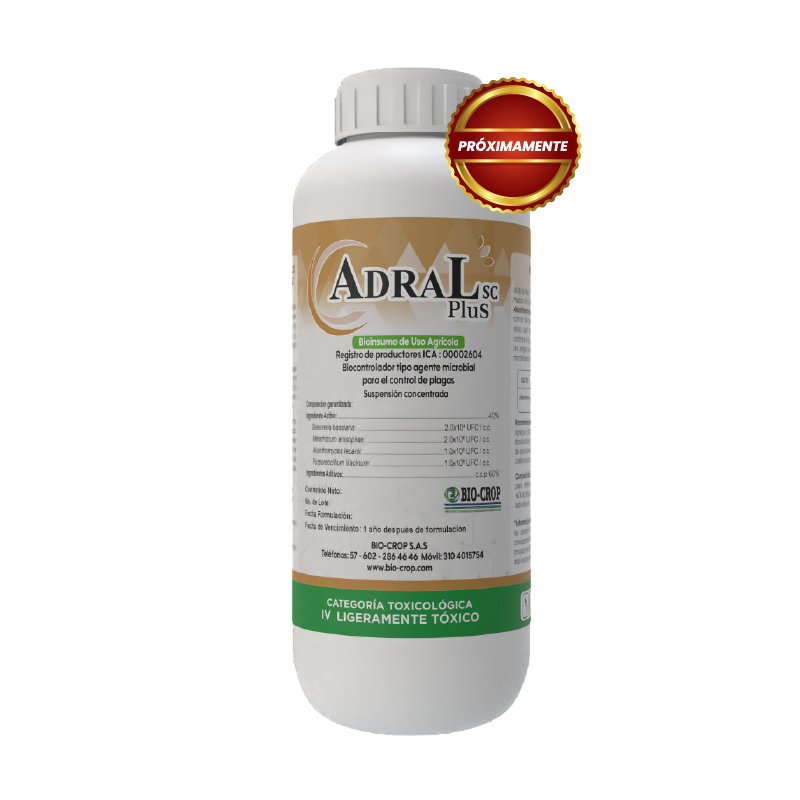 Es un insecticida producido con una cepa patógena natural y selectiva de Beauveria bassiana. Capaz de parasitar insectos del orden Coleóptero principalmente. Cuando las esporas de ADRAL®sc entran en contacto con el cuerpo del insecto germinan e invaden al huésped a través de la cutícula por medio de enzimas que la degradan. Los microorganismos presentes no están genéticamente modificados, no son patógenos y son 100 % naturales.